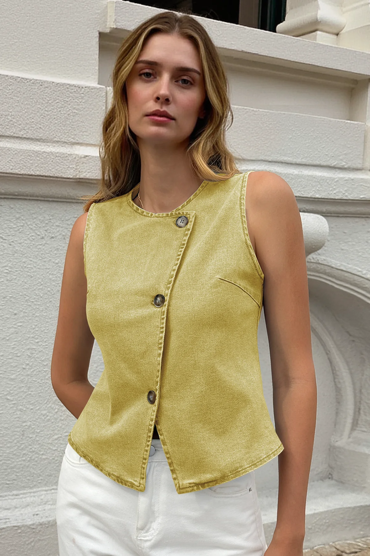 Refresh your wardrobe with this stylish denim sleeveless vest, available in various shades. It features an asymmetric neckline, decorative buttons, and a tailored fit that flatters your figure. Made from high-quality denim, it offers comfort and durability for everyday wear. Perfect for layering over tees, blouses, or dresses, this vest transitions seamlessly from casual to chic looks. Ideal for spring, summer, and fall, it’s a versatile piece that adds a touch of trendy charm to any outfit. A must-have for fashion lovers seeking to elevate their style with a unique, modern twist.