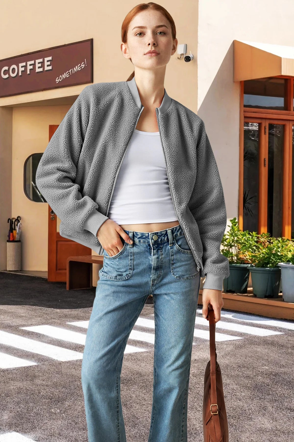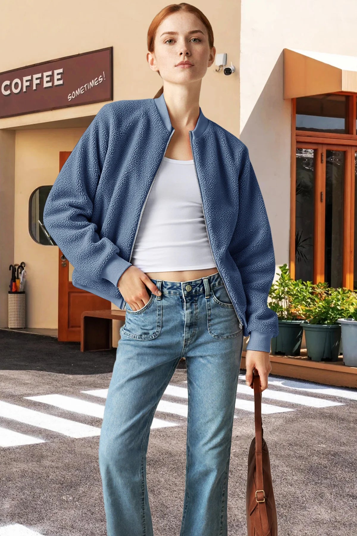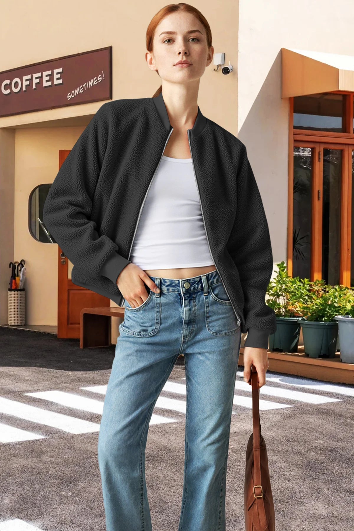 This Women's Sherpa Bomber Jacket is made of soft, fuzzy shearling fabric—features a classic bomber silhouette (ribbed cuffs/hem) for a cozy, trendy look. It’s a perfect cool-weather staple; ideal for pairing with basic tees, ripped jeans, or dresses (great for casual outings, fall/winter days, or adding a plush, chic vibe to outfits). True to size, gentle machine wash is recommended to preserve the sherpa texture.