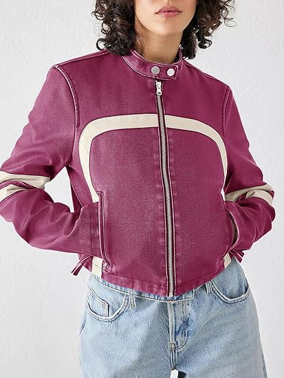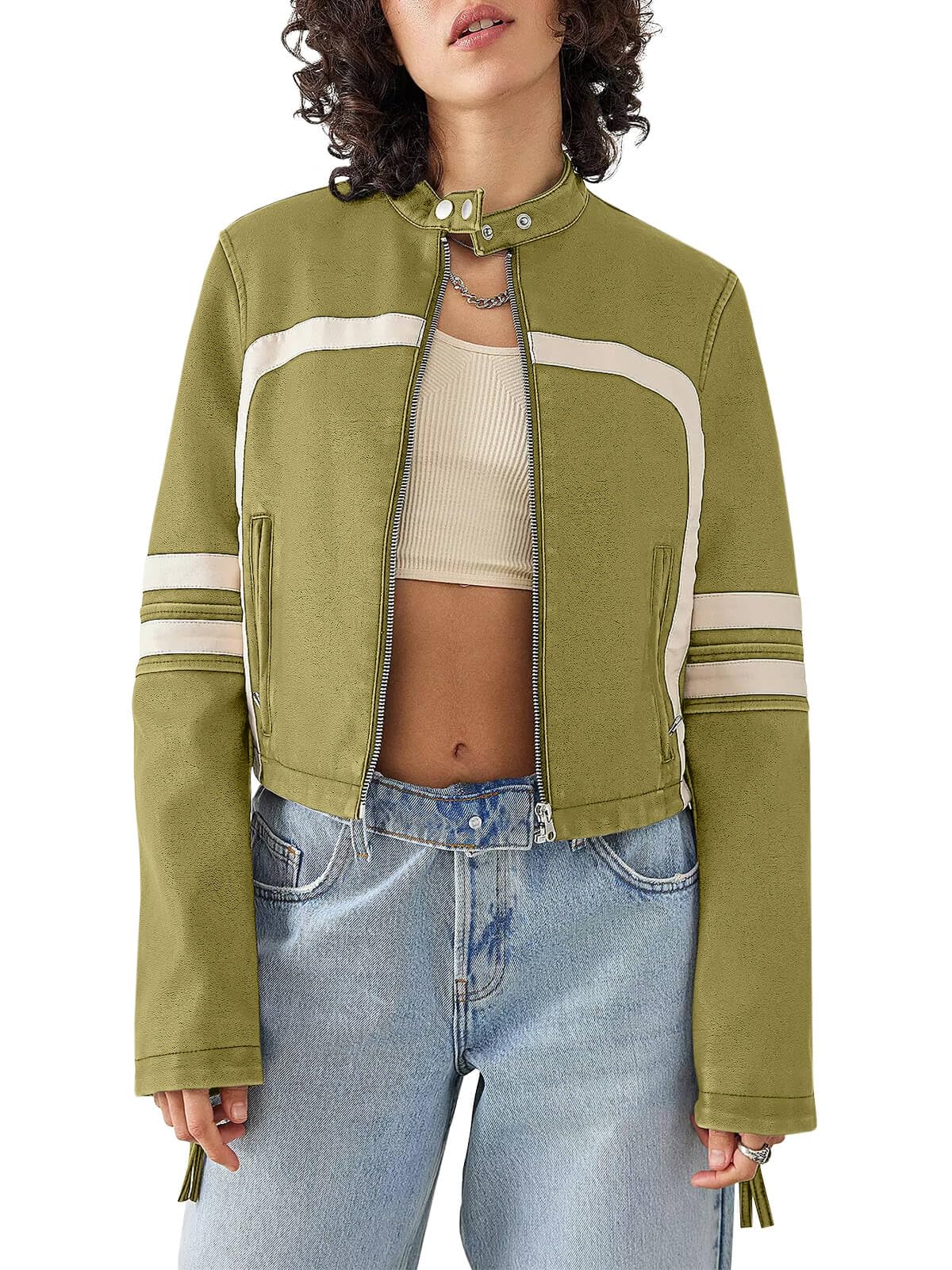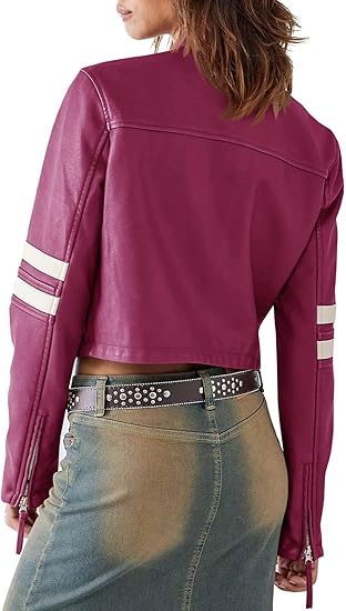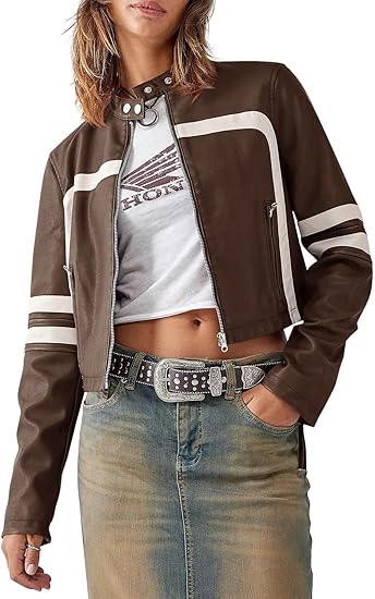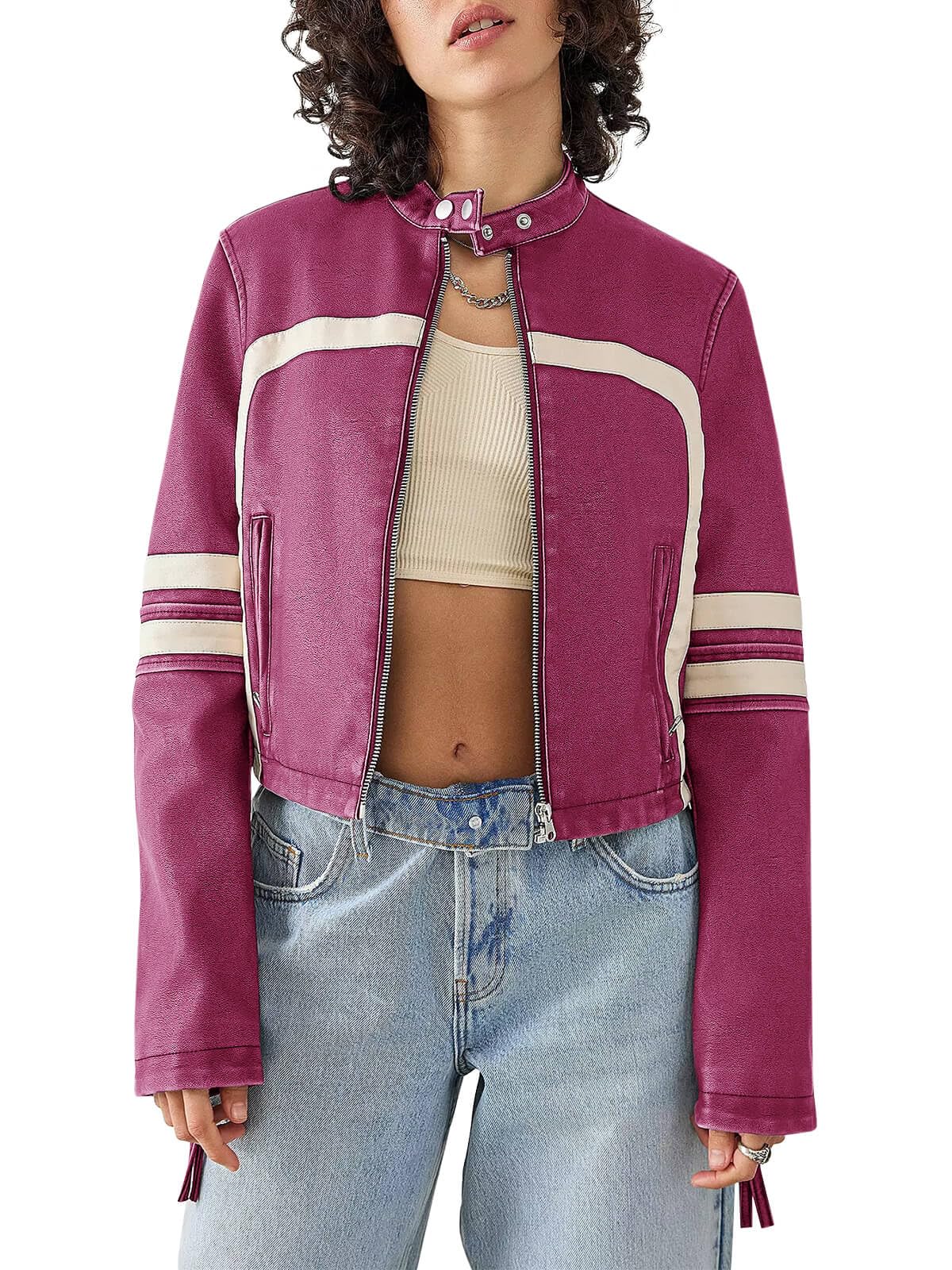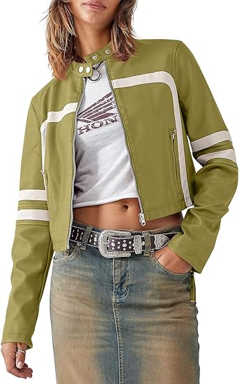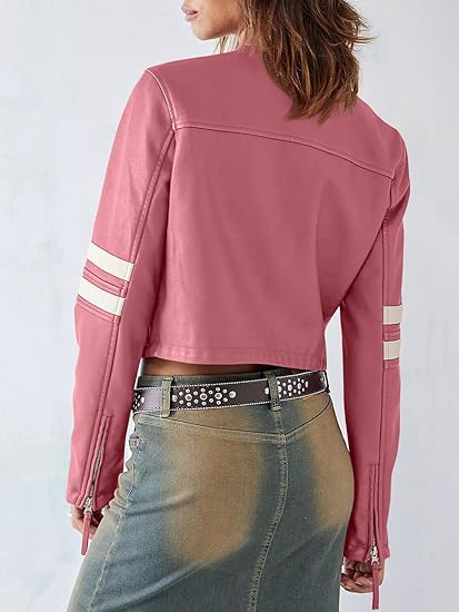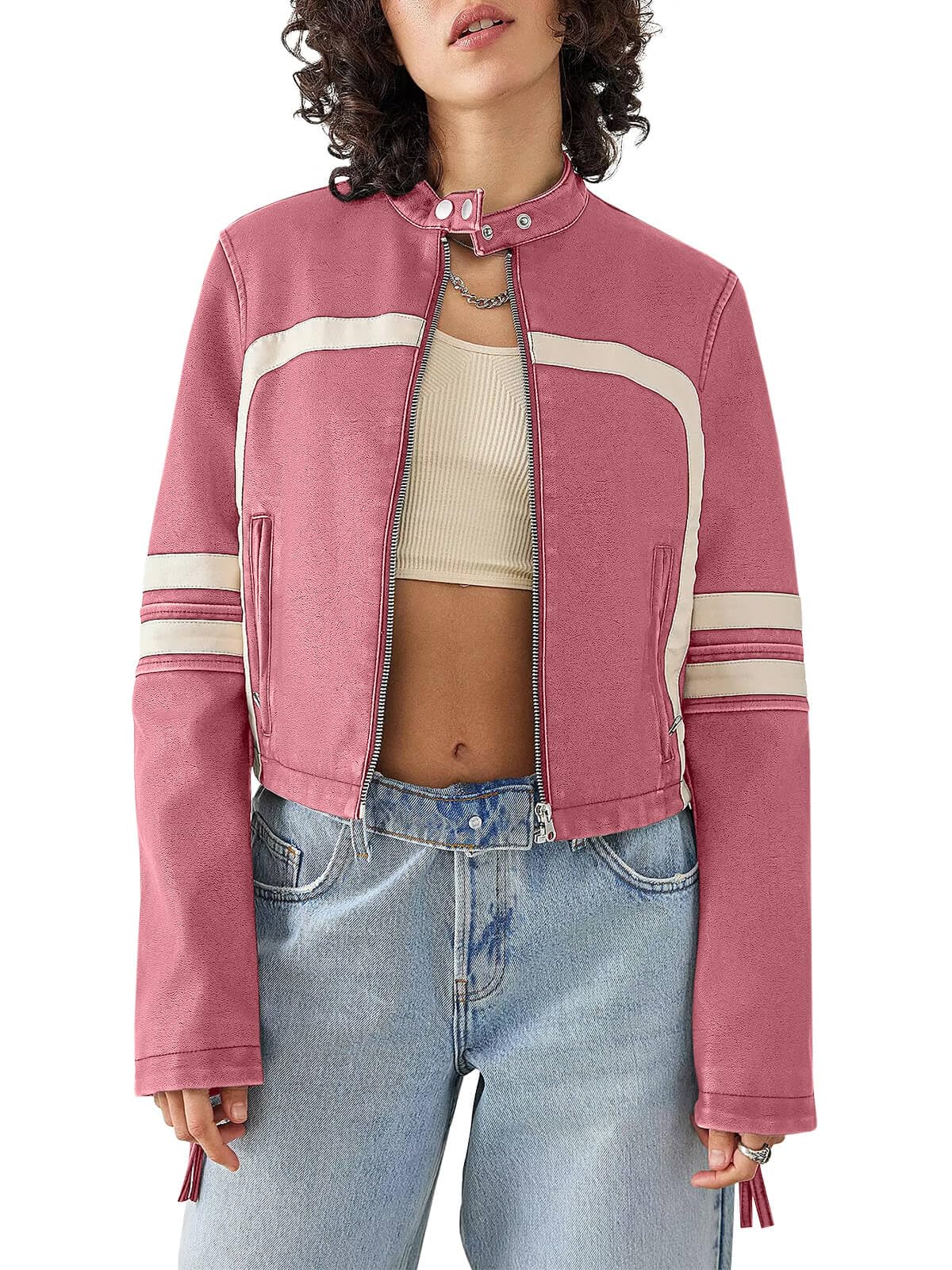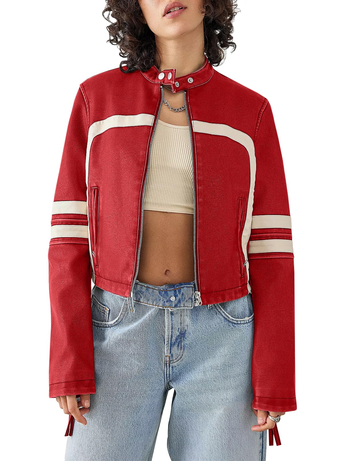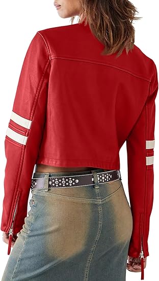 Tankaneo Women’s Faux Leather Jackets Zip Up Stand Collar Cropped Motocross PU Coats