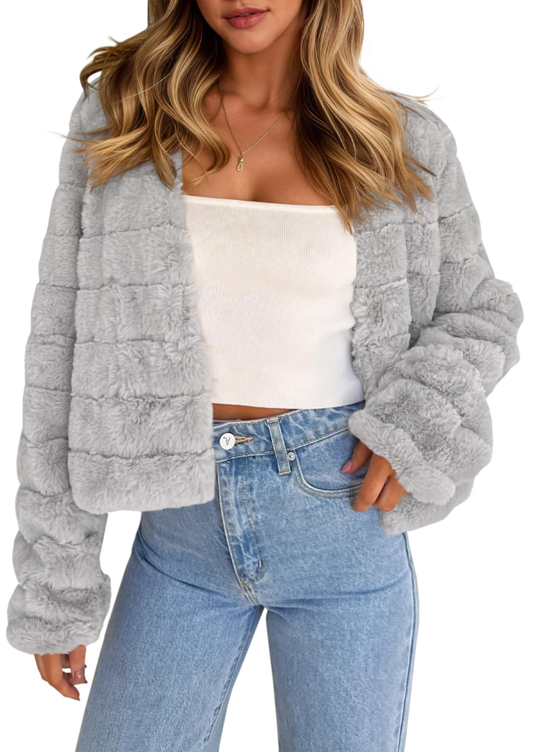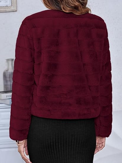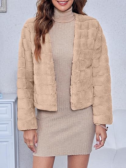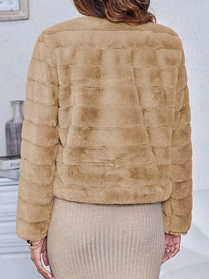 Tankaneo Womens Cropped Faux Fur Jackets Long Sleeve Open Front Fluffy Short Coats