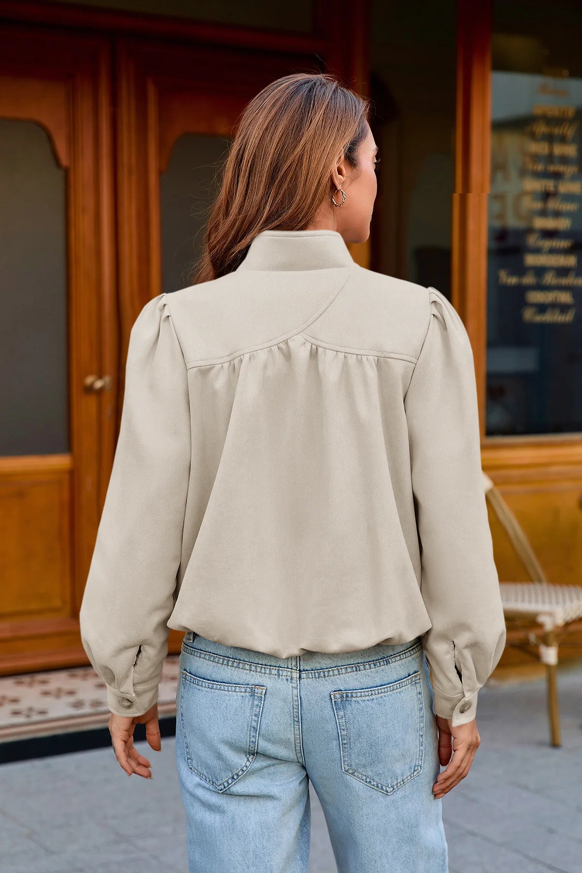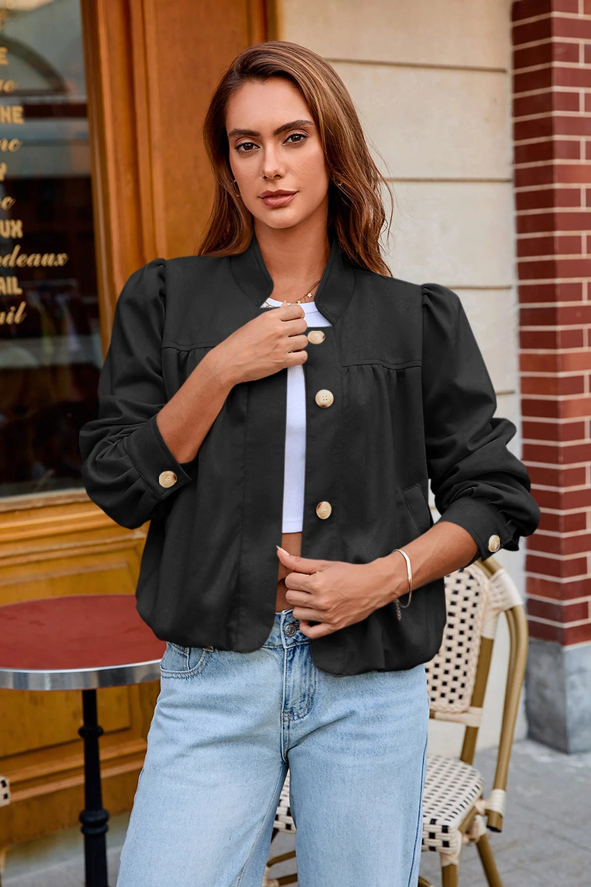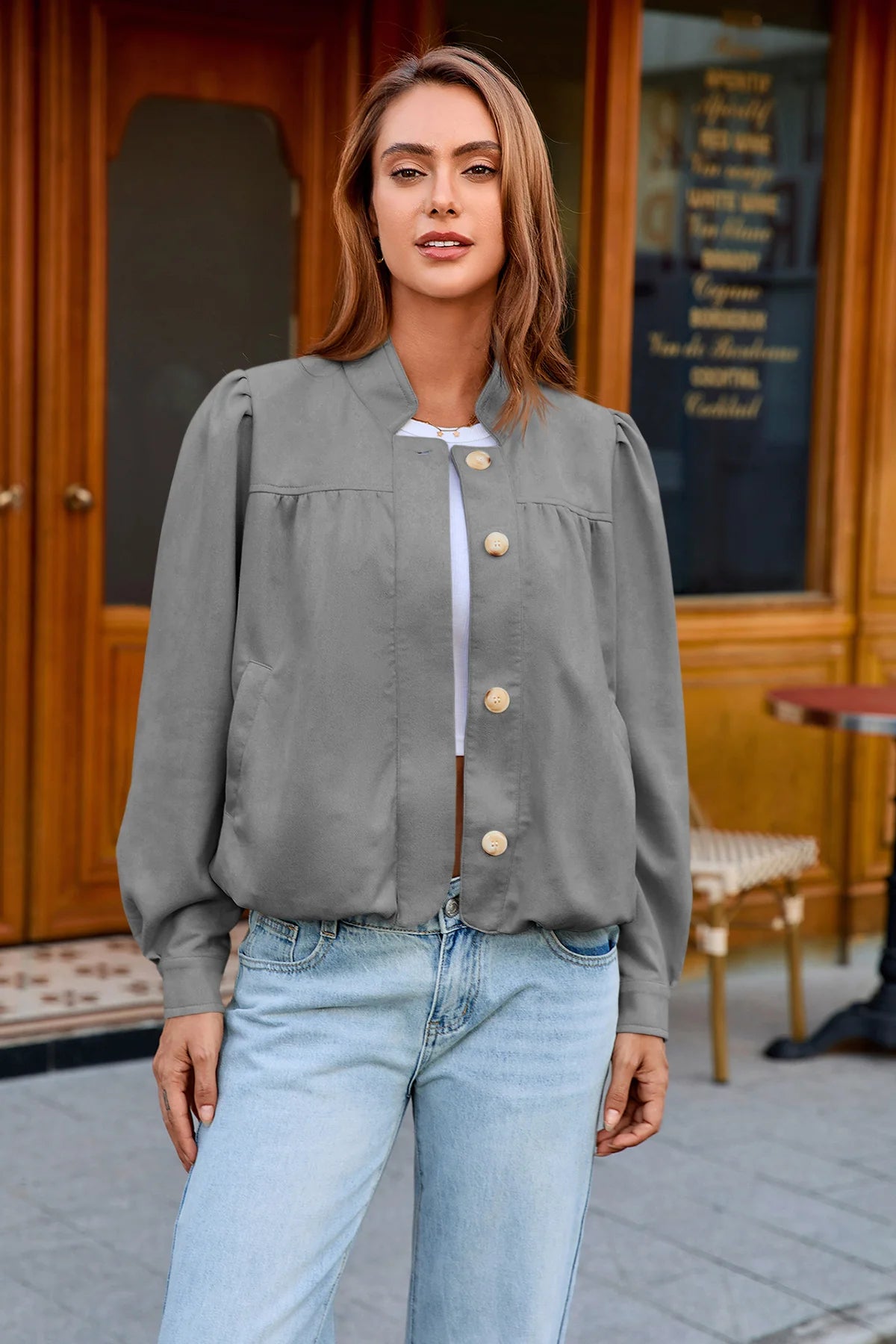 This Women's Puff-Sleeve Button Jacket is made of soft, smooth fabric—features a creamy off-white base, a stand collar, puff long sleeves, and a relaxed fit with functional pockets for a chic, casual look. This is one of our color styles; we offer multiple options. Perfect for layering over tees or blouses with jeans, trousers, or skirts for outings, brunch, or daily wear. True to size, easy to machine wash and maintain.