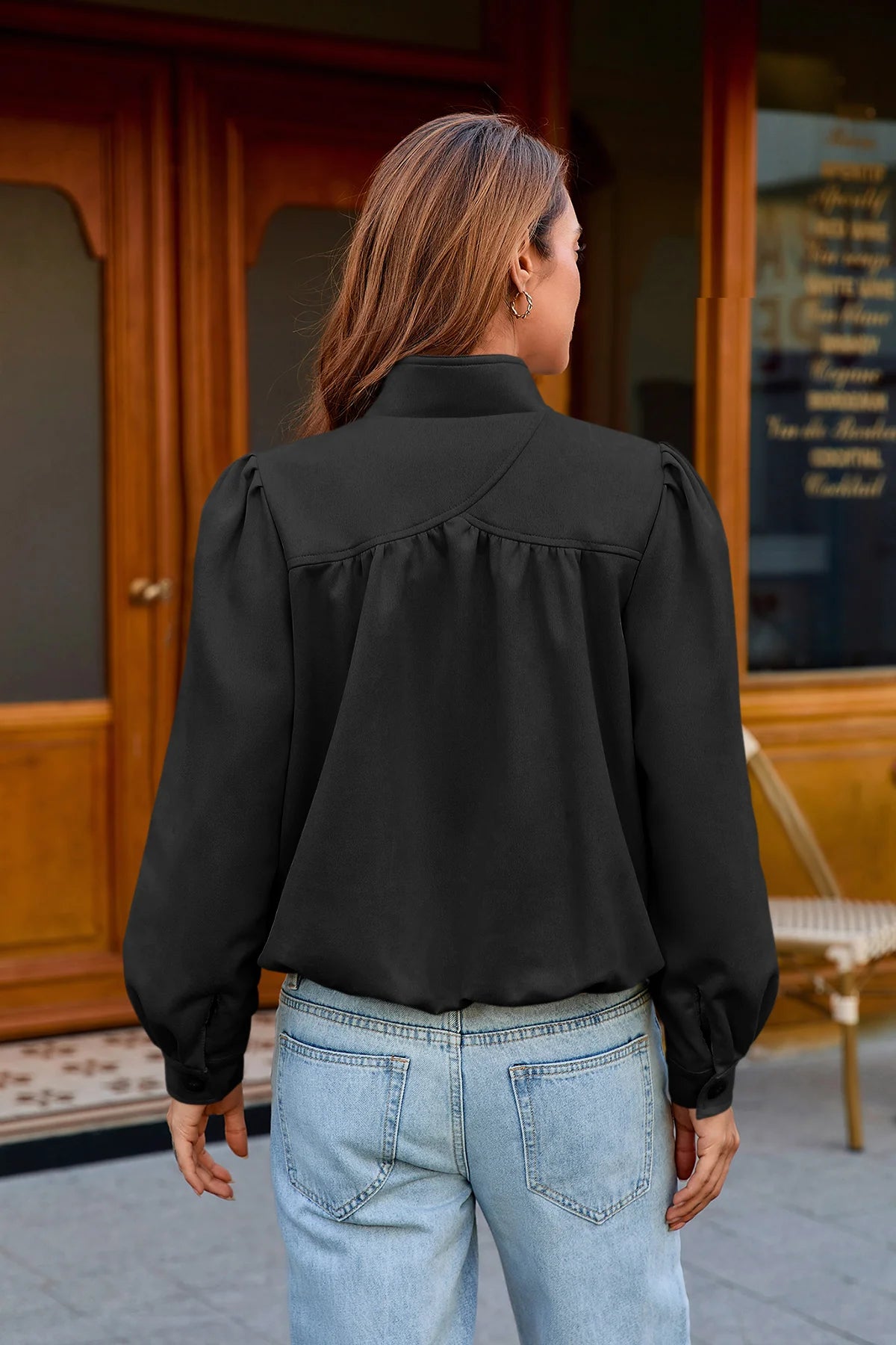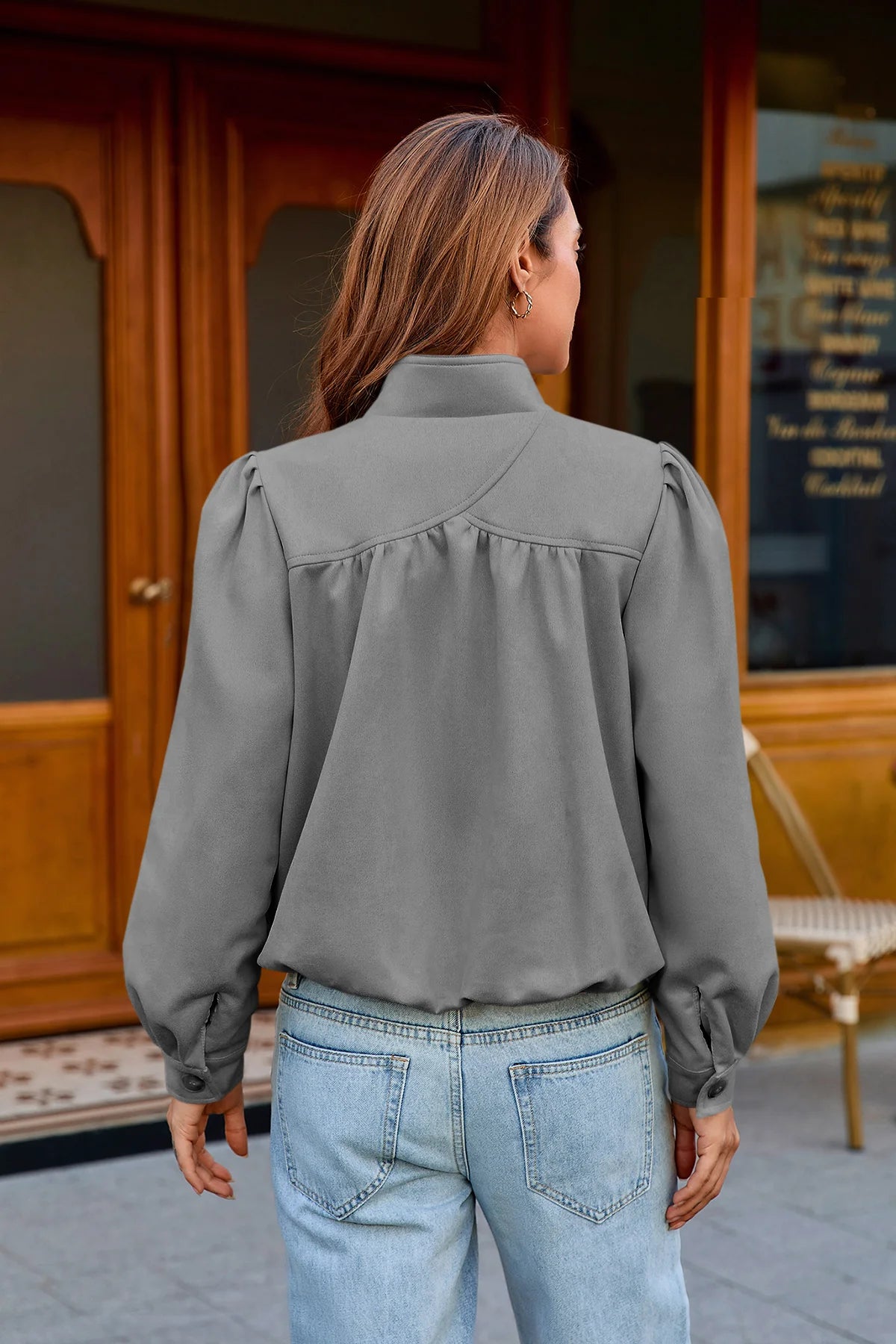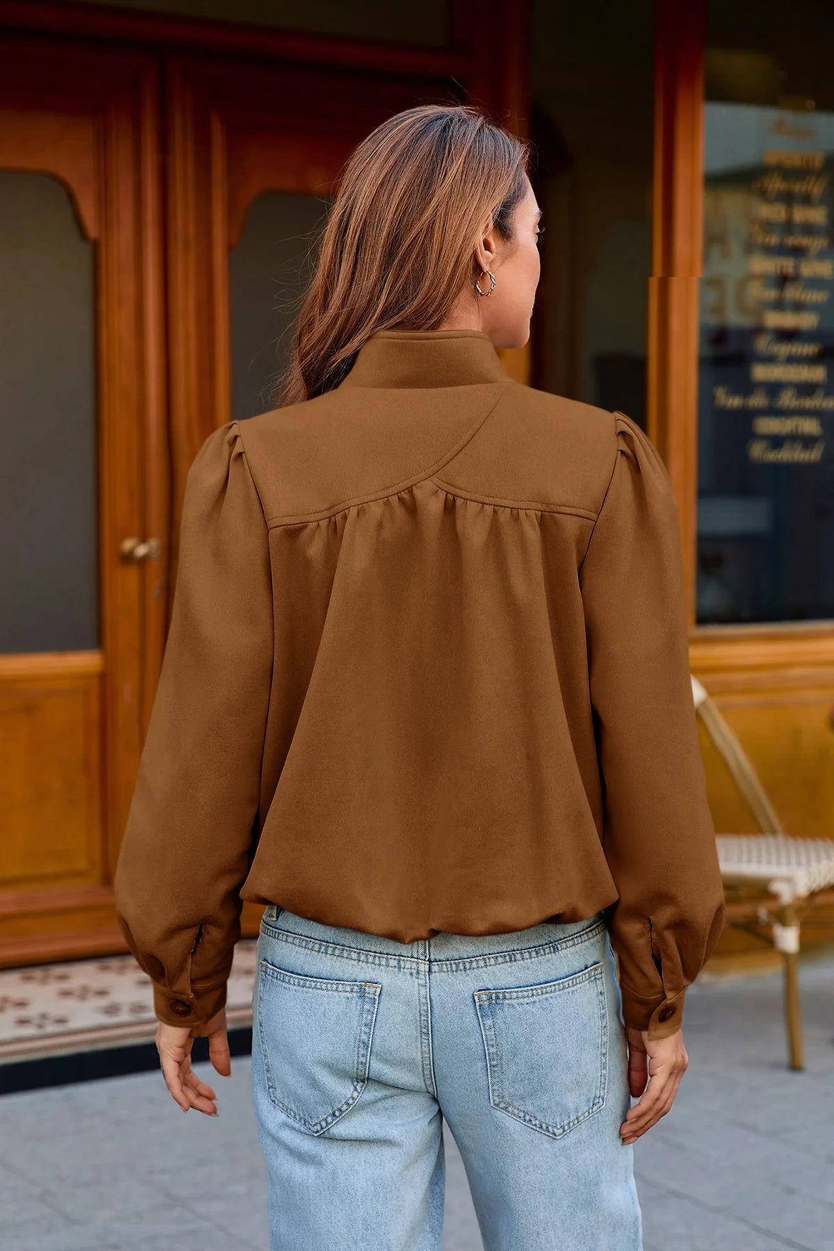 This Women's Puff-Sleeve Button Jacket is made of soft, smooth fabric—features a creamy off-white base, a stand collar, puff long sleeves, and a relaxed fit with functional pockets for a chic, casual look. This is one of our color styles; we offer multiple options. Perfect for layering over tees or blouses with jeans, trousers, or skirts for outings, brunch, or daily wear. True to size, easy to machine wash and maintain.