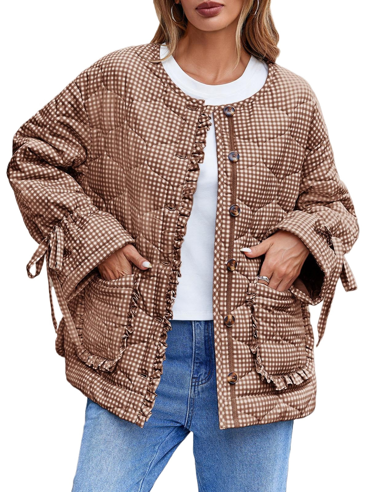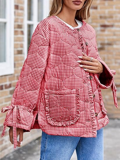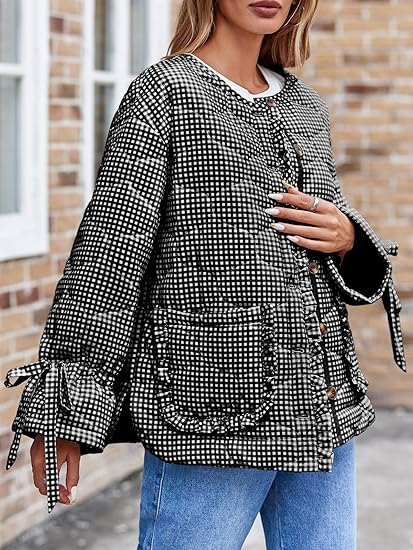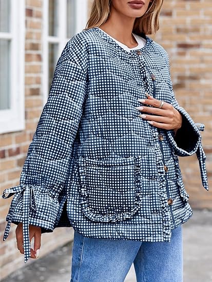 This Women's Gingham Puffer Jacket is made of lightweight padded fabric—features ruffled details and tie cuffs for a playful, stylish look. This is one of our charming cold-weather options; the gingham pattern adds a retro touch. Perfect for layering over tees, sweaters, or dresses (ideal for autumn/winter outings, adding a cute yet warm vibe to outfits). True to size, gentle machine wash recommended.
