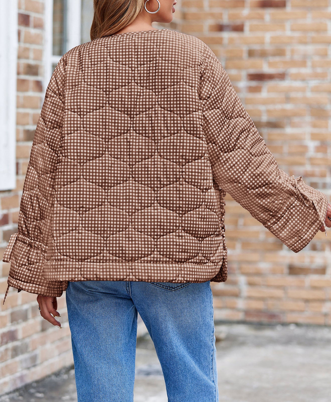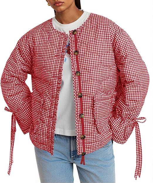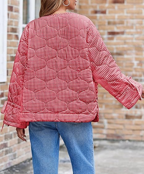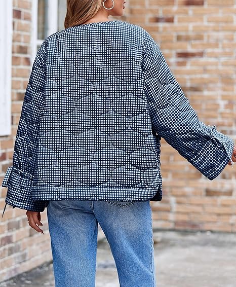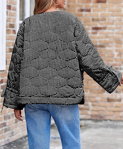 Tankaneo Womens Cropped Quilted Puffer Jackets Lightweight Plaid Button Down Bow Padded Down Coat
