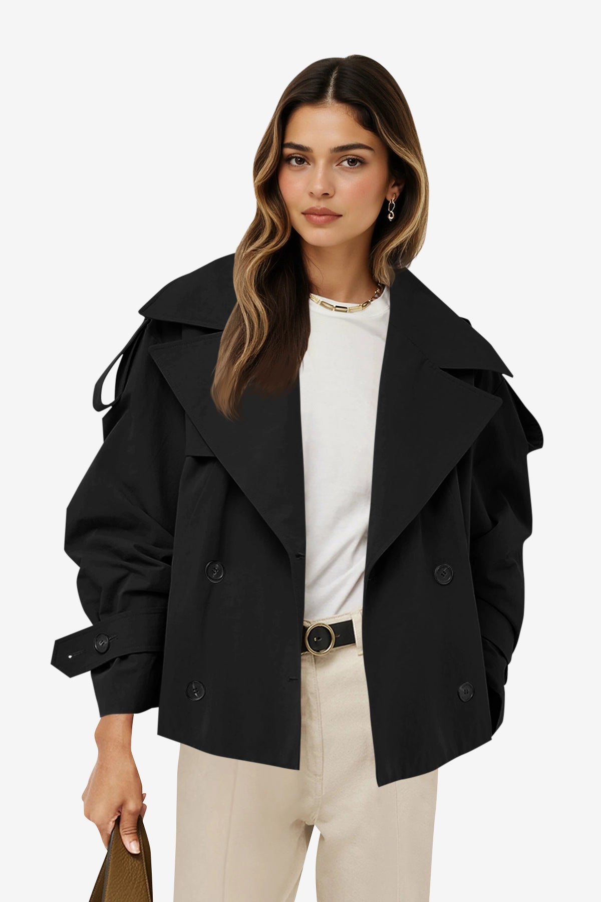 This Women's Cropped Trench Coat is made of sleek, lightweight fabric—features classic trench details: wide lapels, double-breasted buttons, adjustable sleeve cuffs, and shoulder straps. The matching waist belt cinches for a tailored fit, while the cropped length adds a modern twist. This is one of our color styles (black/gray shown); we offer multiple options. Perfect for pairing with jeans, dresses, or skirts for casual outings, commutes, or semi-formal looks. True to size, machine-washable.
