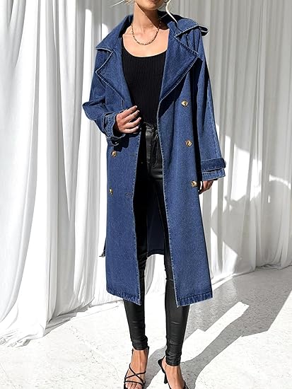 This Women's Denim Trench Coat is made of durable, textured denim fabric—features a double-breasted design, gold buttons and wide lapels for a retro, chic look. It’s a versatile transitional staple; perfect for pairing with black tops, leather pants, or casual tees (ideal for daily commutes, weekend outings, or adding a stylish, laid-back vibe to outfits). True to size, machine wash in cold water is recommended.