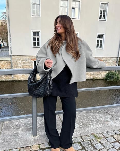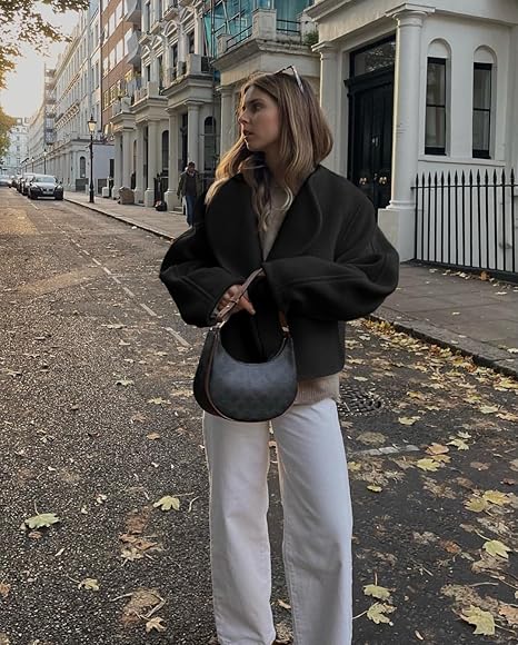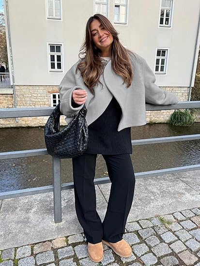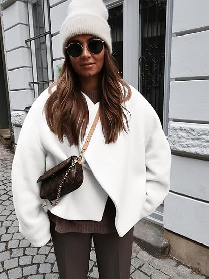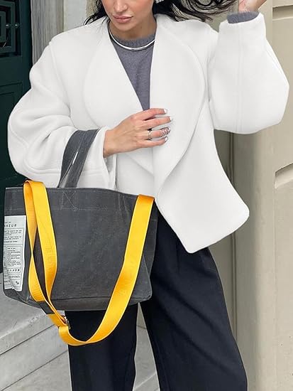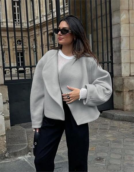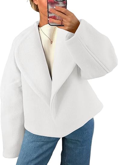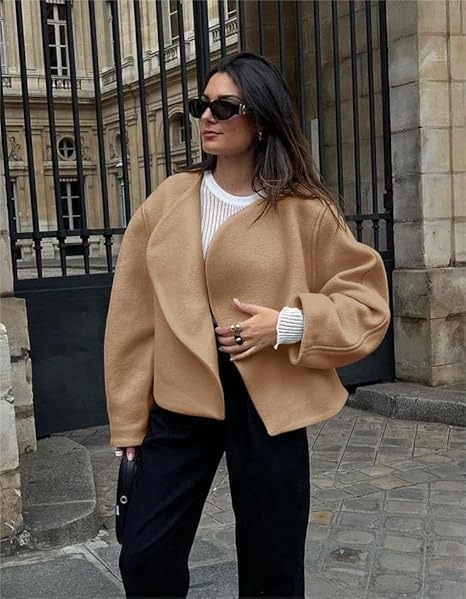 Tankaneo Womens Oversized Cropped Pea Coat Lapel Open Front Jacket Winter Short Outerwear